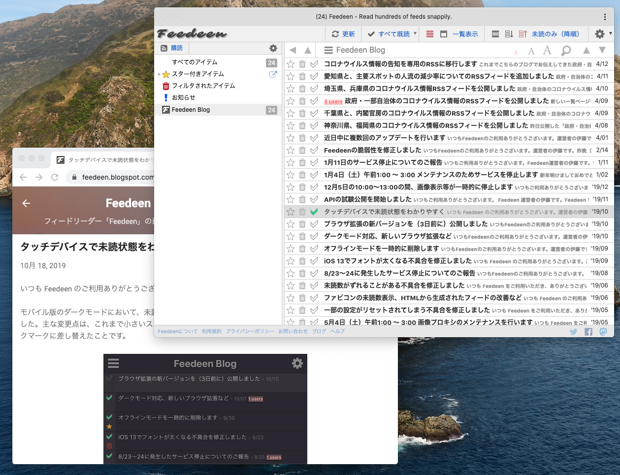 デスクトップ OS では、独立したウインドウでFeedmoonの画面が表示され、 Web ブラウザのアドレスバーなどは一切表示されません。
