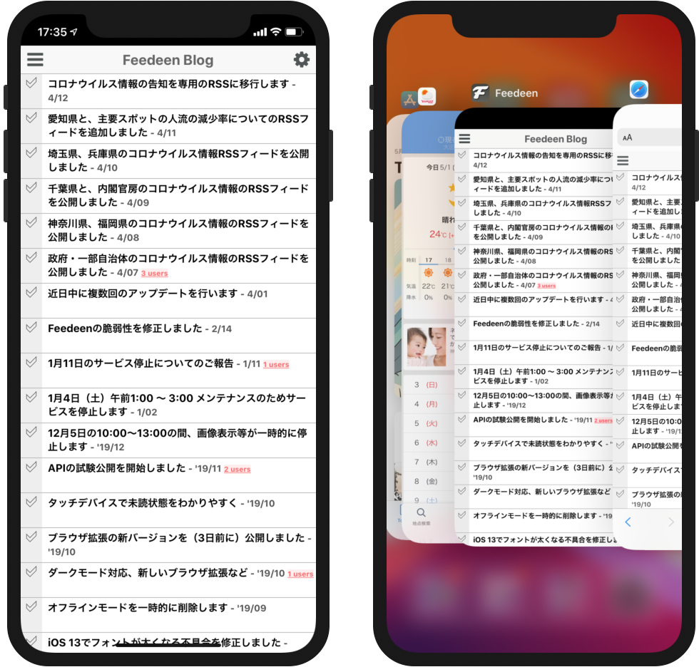 iOS や Android などでは、ホーム画面に追加されたアイコンから起動でき、アドレスバーなどがないフルスクリーンでFeedmoonが動作するようになります。 OS のアプリスイッチャーでも独立したアプリとして表示され、簡単にアプリの切り替えが可能です。