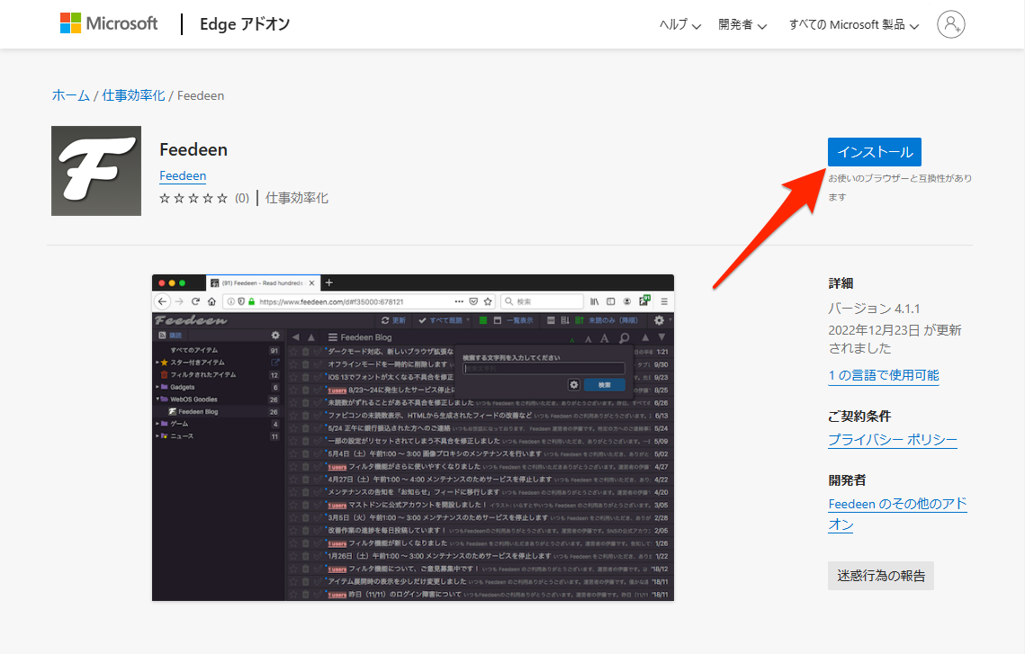 Microsoft Edge で上記 URL を開き、ページの右上にある「インストール」ボタンをクリックすることで拡張機能をインストールできます。