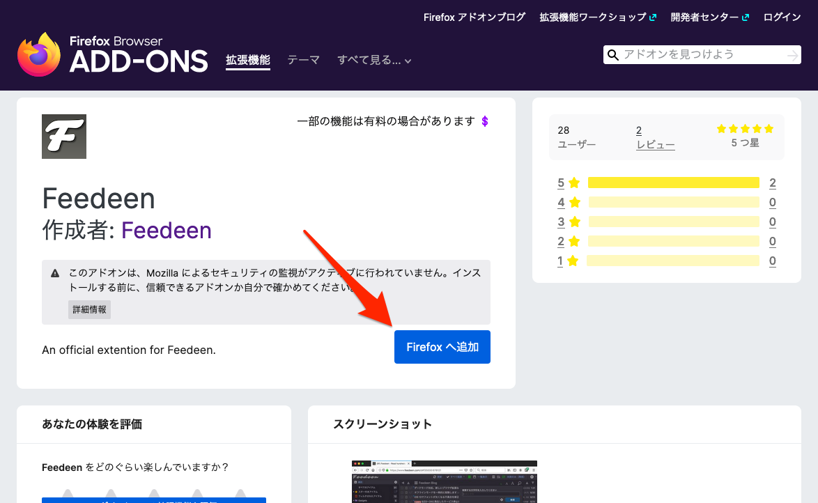 Firefox で上記 URL を開き、Feedmoon ロゴの右にある「Firefox へ追加」ボタンをクリックすることで拡張機能をインストールできます。