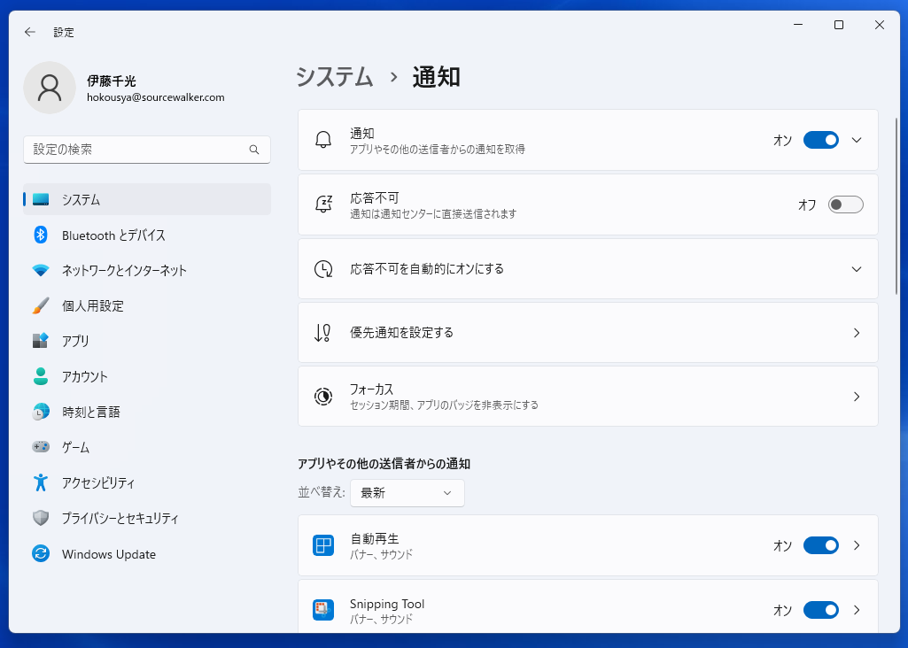 Windows では、設定アプリの「システム」 > 「通知」でアプリごとの通知の設定ができます。
