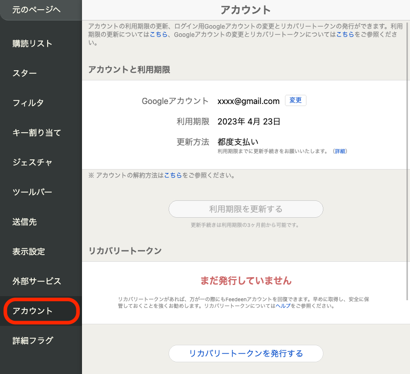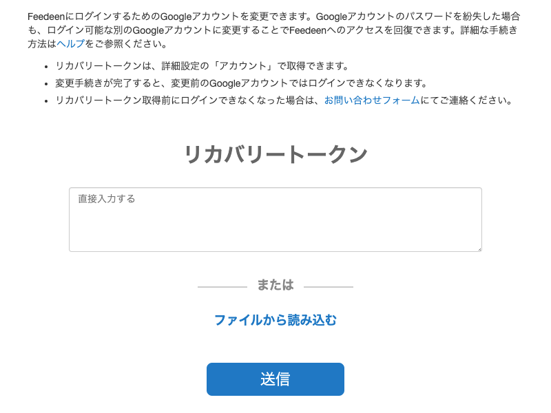 あらかじめリカバリートークンを取得しておいていただければ、このような状況でもGoogleアカウントの変更が可能となり、Feedmoonアカウントへのアクセスを回復できます。