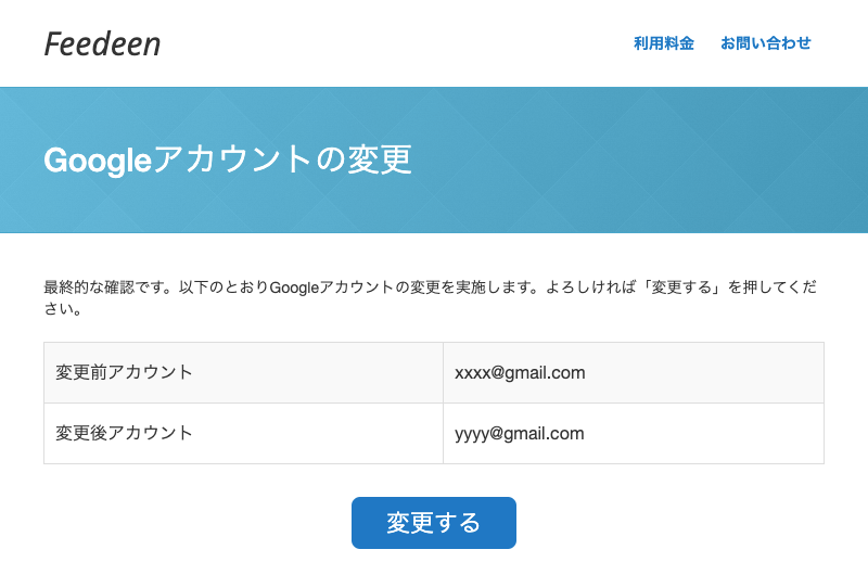 リカバリートークンを生成したアカウントのメールアドレスが表示されます。確認し、間違いなければ「変更する」ボタンを押してください。