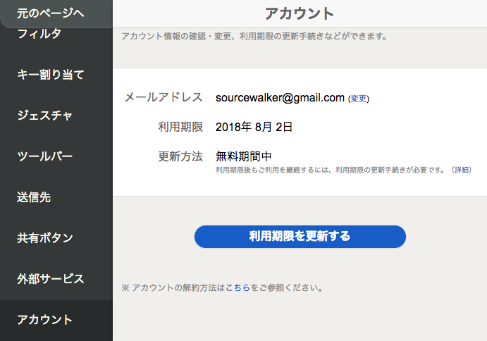 利用期限の更新手続きは、詳細設定のアカウント画面から開始できます。以下のリンクでアカウント画面を開いてください。