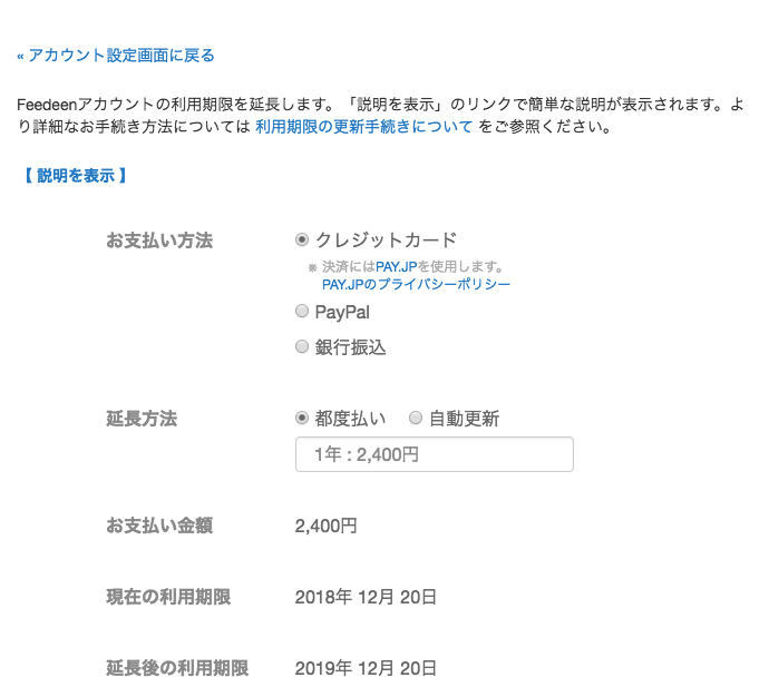 Feedmoon の利用期限の更新には、利用料金の支払手段として以下が必要になります。