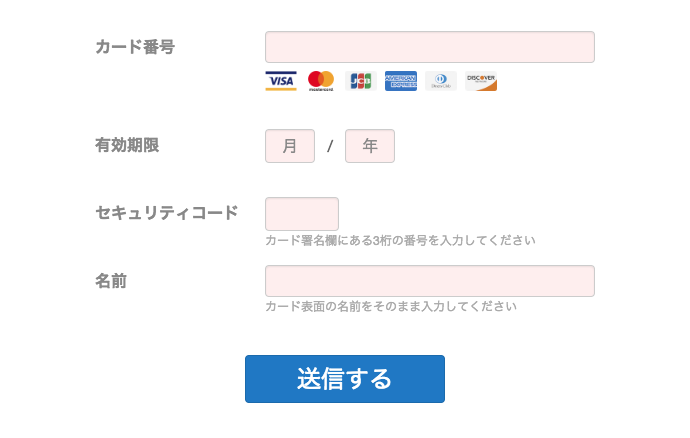 お支払い方法でクレジットカードを選択すると、フォーム後半にクレジットカードの情報を入力する項目が表示されます。